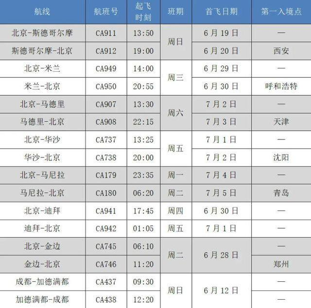 近期,国航陆续恢复多条国际航线,涉及欧洲、亚洲多个城市,每条航线每周往返执飞一班,具体信息如下:
