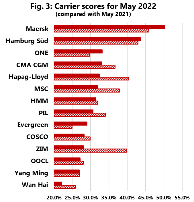 “以 50.3% 的时间表可靠性,马士基是 2022 年 5 月最可靠的承运人,其次是汉堡南美,为 43.7%,”Sea-Intelligence 在其报告中指出,并补充说,“有六家承运人的时间表可靠性为 30%-40 % 和 6 的进度可靠性为 20%-30%。”