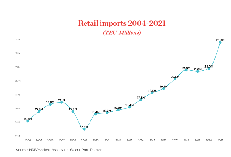 根据美国零售联合会(NRF)和哈克特协会(Hackett Associates)发布的月度全球港口跟踪报告,今年春季,美国港口进口再次创下新高。