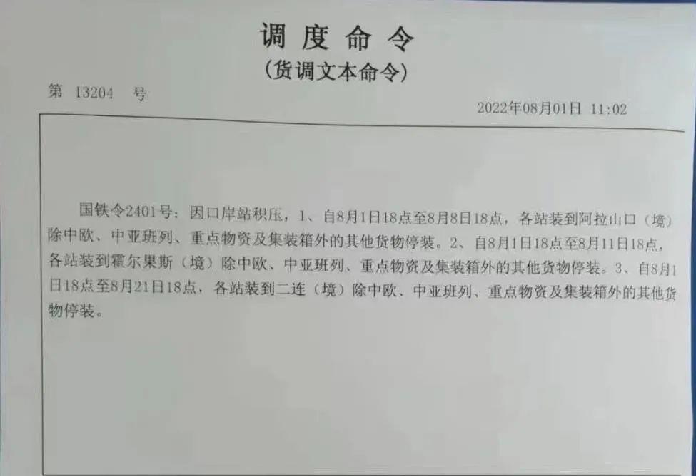 8月1日,铁路部门发布紧急调度命令:因阿拉山口、霍尔果斯以及二连口岸站积压严重,决定自8月1日18时起,对从三大口岸出口的部分货物停装,其中停装时间最长将达21天!