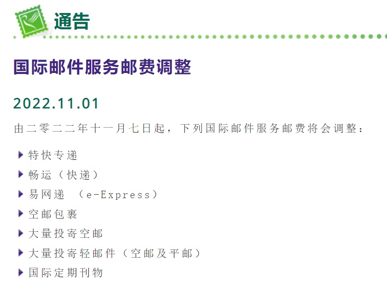 公告显示,自11月7日起以下国际邮件服务邮费将会调整:特快专递、畅运(快递)、易网递 (e-Express)、空邮包裹、大量投寄空邮、大量投寄轻邮件(空邮及平邮)、国际定期刊物。