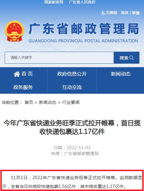 2022-11-04 飞时达国际快递-代理fedex,DHL,UPS,EMS航空大包及海运服务,11月3日消息,广东省飞时达国际快递公司管理局近日发布消息称,监测数据显示,11月1日全省共揽投快递包裹1.56亿件,其中揽收量达1.17亿件。