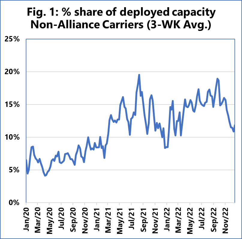 2022-11-04 飞时达国际快递-代理fedex,DHL,UPS,EMS航空大包及海运服务,根据Sea Intelligence的最新分析,在过去两年的跨太平洋市场高峰时期,非联盟集装箱运输公司的市场份额从5%左右翻了三倍,达到15%左右。