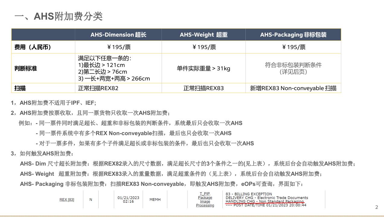 AHS- Packaging  非标包装附加费:扫描REX83 Non-conveyable ,即触发AHS 附加费,eOPs可查询,界面如下: 可查询,界面如下: