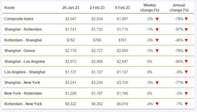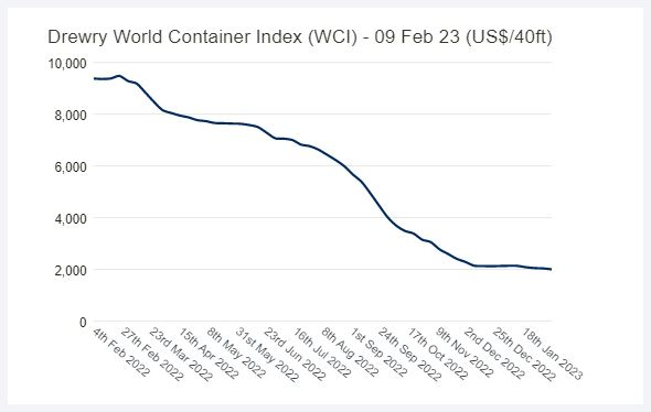 德鲁里世界集装箱指数(WCI)自2020年7月以来首次跌破2000美元的心理关口,这是中国春节后报道的第一组报价。