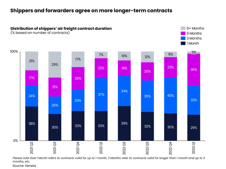 从2023年第一季度托运人合同期限的分布来看,六个月的协议数量从去年第四季度的23%上升到36%。
