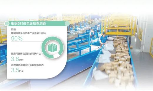 根据5月份包裹抽查测算,目前,我国电商快件不再二次包装比例达90%,使用可循环包装的邮件快件达3.8亿件,回收复用质量完好的瓦楞纸箱达3.5亿个。