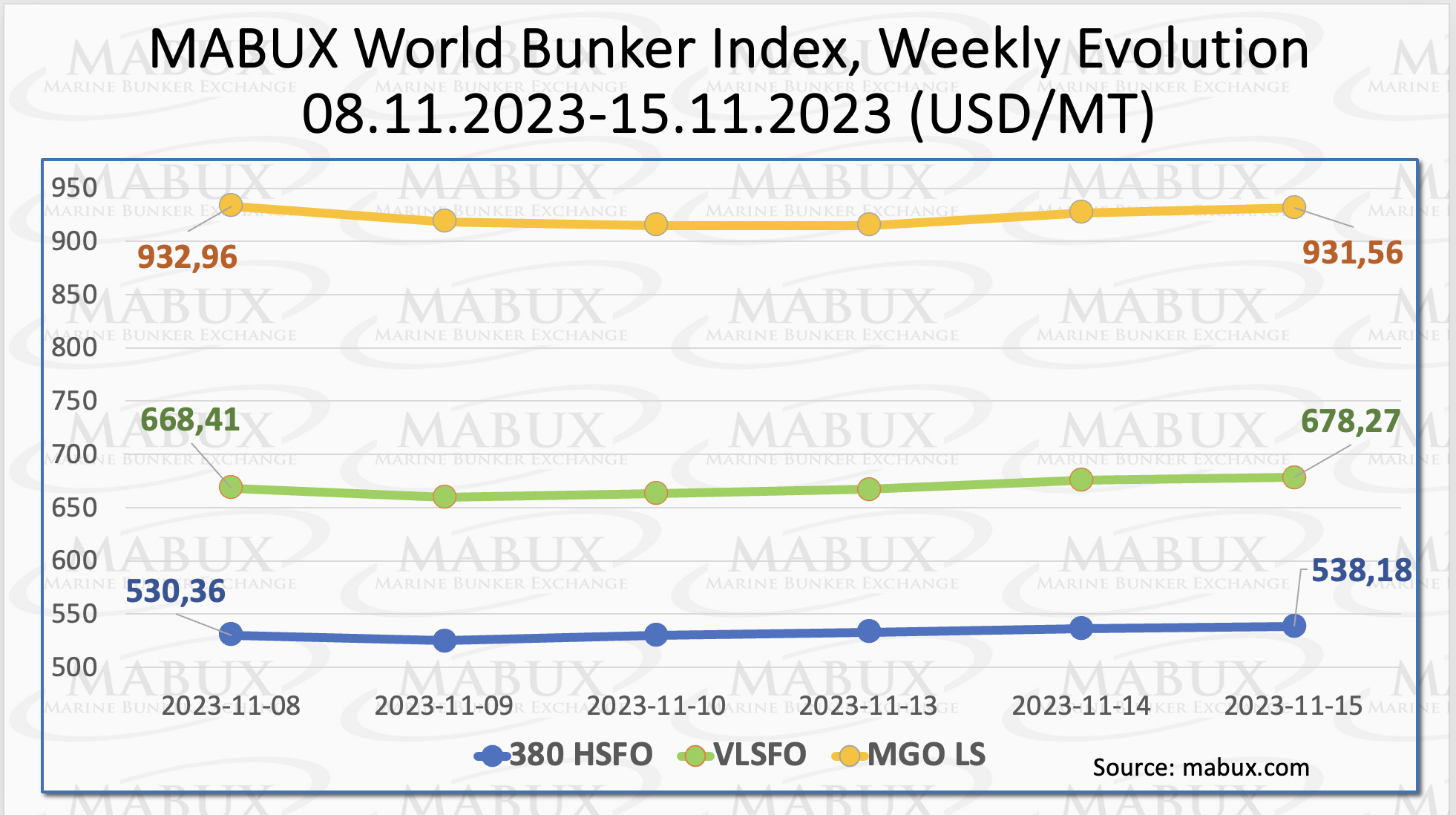 2023-11-19 海洋燃料交易所(MABUX)全球指数在今年第46周表现出温和的变化,没有确定的动态。