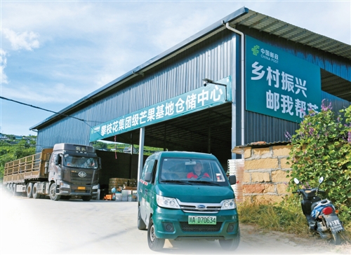 装满芒果的邮车驶出兵之初合作社芒果基地仓储中心。