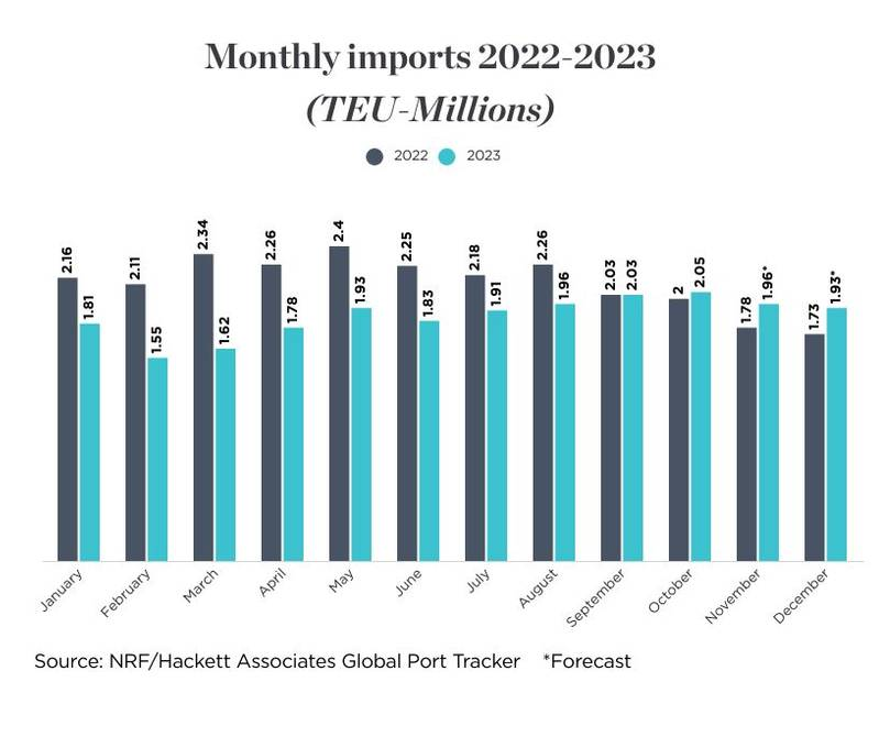 美国全国零售联合会(National Retail Federation)和哈克特协会(Hackett Associates)最近发布的《全球港口追踪》(Global Port Tracker)报告显示,美国主要集装箱港口的入境货运量在今年秋天晚于预期达到峰值后,将在2023年的最后几周继续放缓。