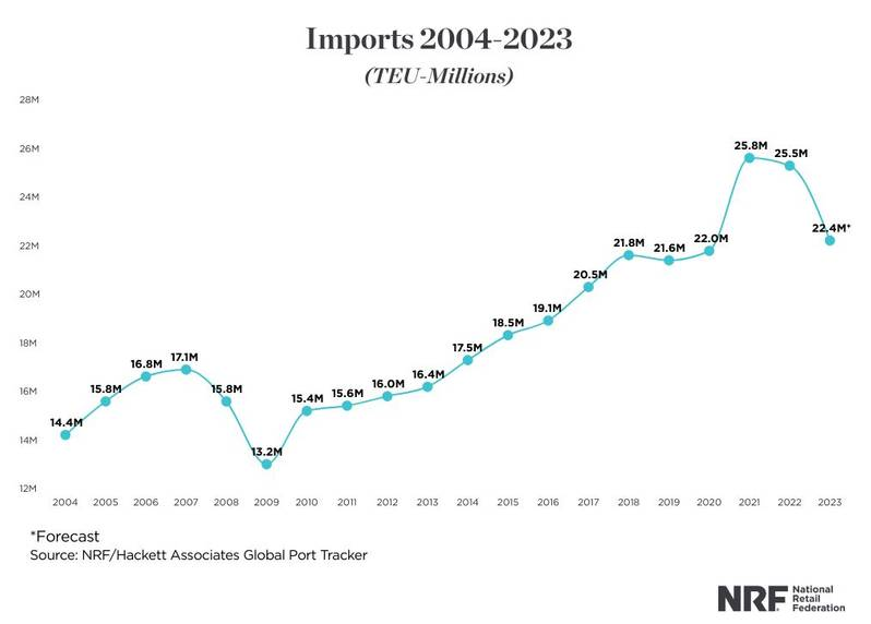 这些数字将使2023年达到2240万TEU,比去年下降12.4%。2022年的进口总量为2550万TEU,比2021年创下的2580万TEU的年度纪录下降了1.2%。