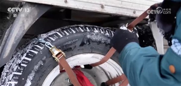 一大早,吉林临江市乡邮员王明杰在整理完今天要送的快递包裹后,将小型面包车更换成自重更大的箱货车,为车胎绑上防滑链。
