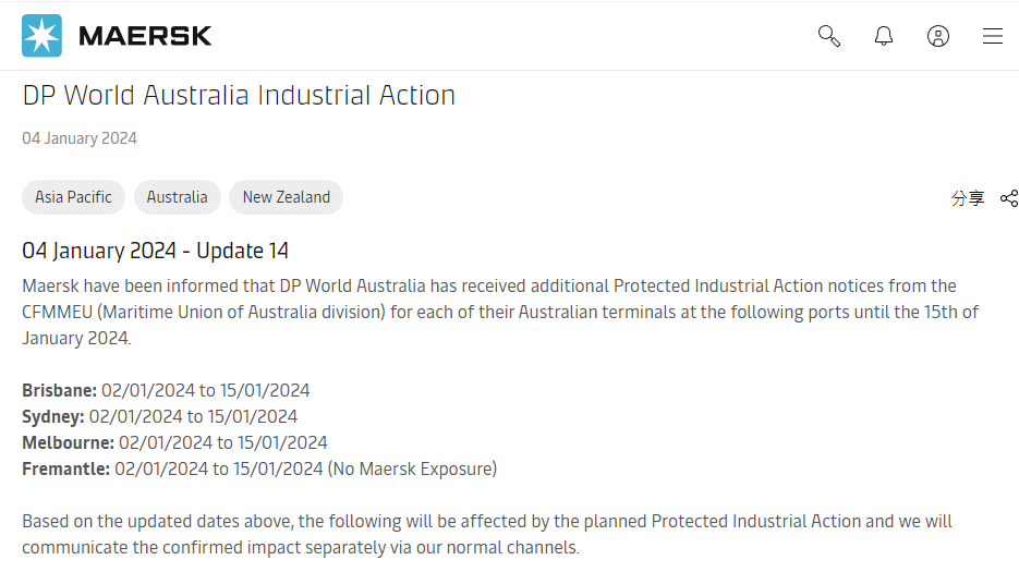 据了解,马士基在1月4号通知,由于DP World在澳大利亚的港口受到罢工行动的影响,罢工将持续到1月15日。
