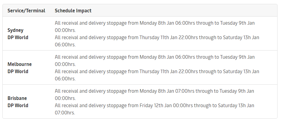 注意:在悉尼港和墨尔本港,当地时间2024年1月8日6:00至1月9日00:00,以及当地时间1月11日22:00至1月13日6:00,相关码头将停止所有收发货。