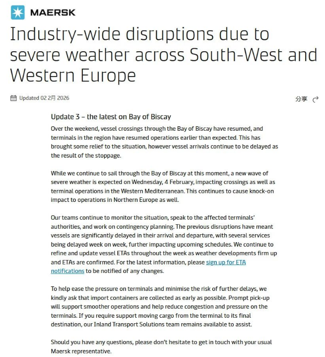 马士基、达飞轮船相继在1月28日、29日发布紧急公告:欧洲物流网络正陷入严峻困境!