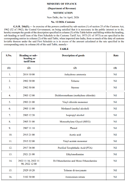 2026年4月2日,印度财政部发布NotificationNo.12/2026-Customs通知,对40类石化、塑料及工业原料全额免征基础进口关税(BCD)及农业基础设施开发税(AIDC),政策有效期自公告发布起至6月30日。