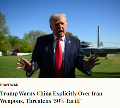 50%关税威胁!特朗普警告中国勿援伊朗武器 2026 年 4 月 15 日发布