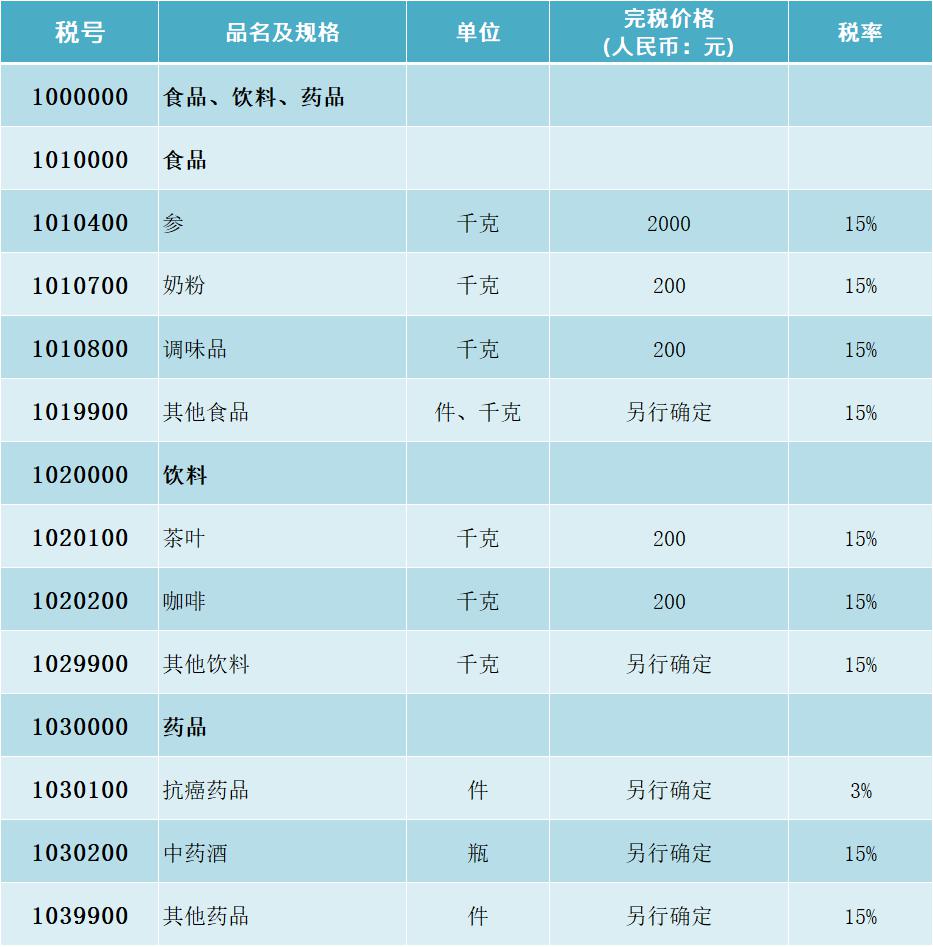 关于食品、饮料、药品:奶粉、咖啡、茶叶、中药的更多税率表详情表,请查看下图(含详细品名、单位、完税价格和税率)