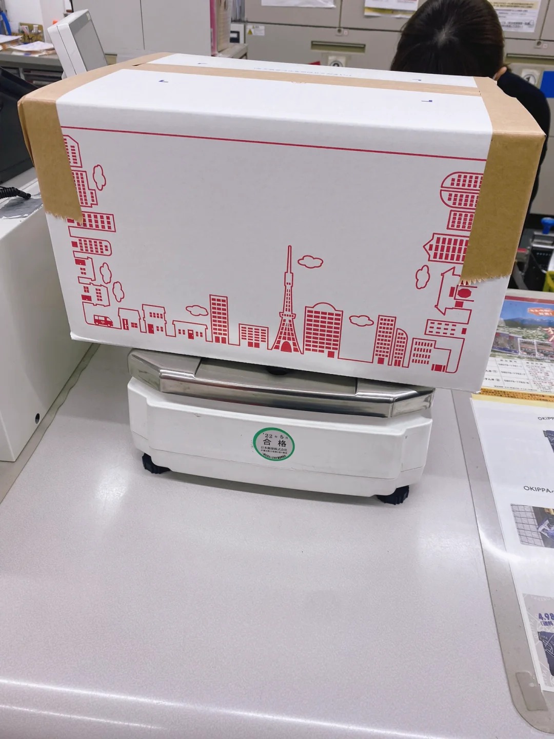 带着打印好的快递单和要寄的物品去邮局吧!先在门口机器上取号,等柜员叫号后办理。可以自己准备快递箱,也可以在邮局买,有三种尺寸可选。我寄2kg的东西买了80size的箱子,刚好合适,140日元。然后按照柜员指示在三张纸上签字,称重后交钱,拿到小票就完成啦!🎉📦