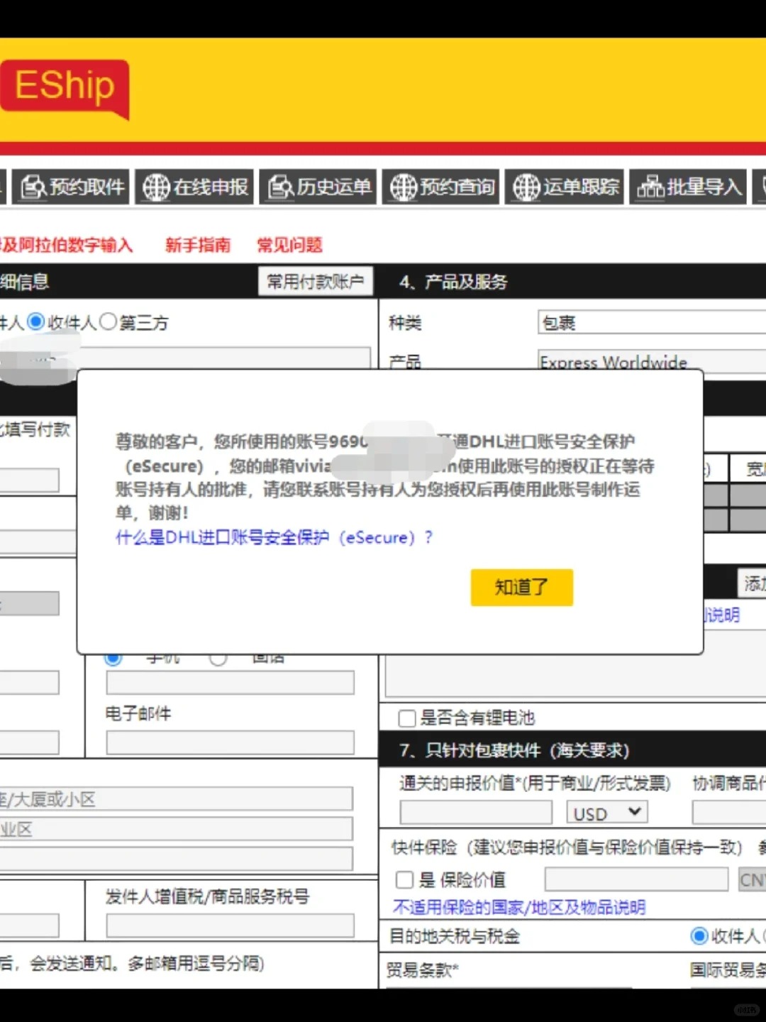 🔑 首先,登录你的DHL通用账号,然后填上客户的到付账号(记得哦,DHL的到付账号一般是95/96开头的)。填好后,DHL会发封邮件给客户,等客户授权我们的邮箱寄件就OK啦!💌