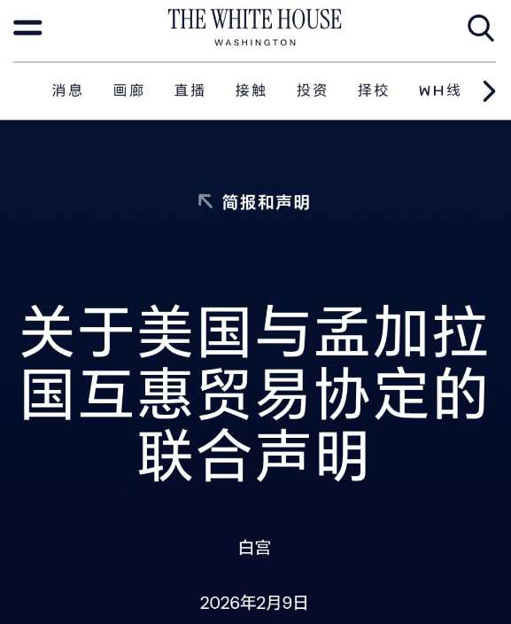 2026年2月9日,美国与孟加拉国签署了一项新的双边贸易协议(Reciprocal Trade Agreement),美国将对孟加拉国出口产品的对等关税从 20% 进一步降低至 19%。这一调整是继2025年8月从最初拟定的37%降至20%之后的又一次下调,为孟加拉国的出口行业尤其是成衣制造业提供了进一步缓解。