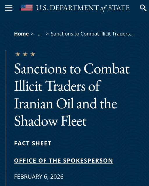 根据美国国务院2026年2月6日的官方公告,美国财政部外国资产控制办公室(OFAC)将制裁针对与伊朗石油、石油产品和石化产品非法贸易相关的15个实体、2名个人和14艘影子船队船只。涉及国家包括英国、印度、土耳其、中国及阿联酋等国。